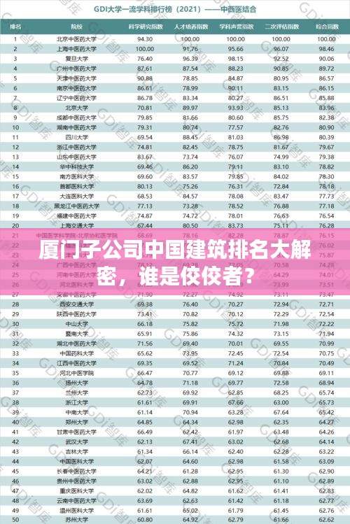 厦门,这座美丽的海滨城市,不仅是旅游胜地,也是众多企业竞相发展的热土,在中国建筑领域,厦门的子公司以其卓越的表现和实力,赢得了业界的高度评价,本文将对中国建筑厦门子公司的排名进行一番探讨。
