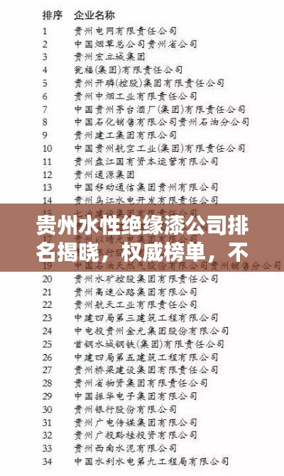 贵州,这片充满生机与活力的土地,近年来在工业领域涌现出众多优秀企业,尤其在水性绝缘漆领域,不少公司凭借卓越的产品质量、创新的技术及良好的服务赢得了广大客户的信赖,本文将为您详细介绍贵州水性绝缘漆公司的排名,带您了解这些在行业内颇具影响力的企业。