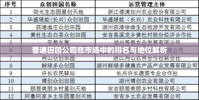 在当今竞争激烈的市场环境下,普通田园公司在行业内的发展越来越受到关注,本文将探讨普通田园公司的排名及其在当前市场中的地位,分析其在行业内的竞争优势和劣势,并简要介绍其发展历程和主要业务。