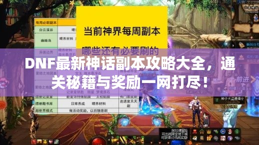 随着游戏的不断更新,神话副本的难度和内容也会有所调整,玩家需关注游戏的最新消息,以便更好地挑战新的副本,希望广大玩家在游戏中不断摸索,发现更多的攻略和技巧,共同为DNF的游戏世界增添更多的乐趣。