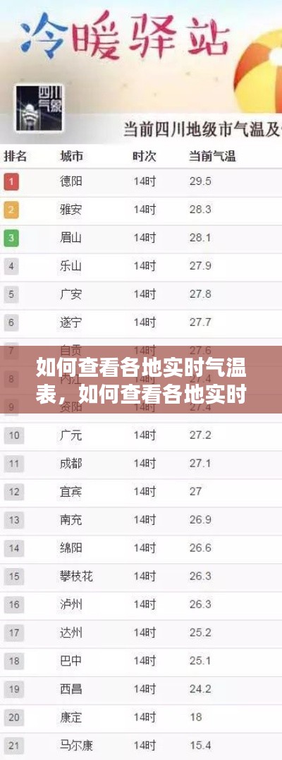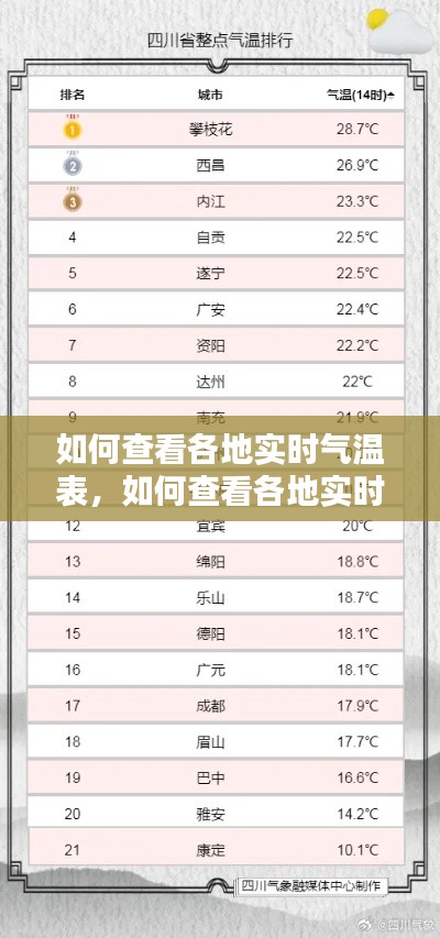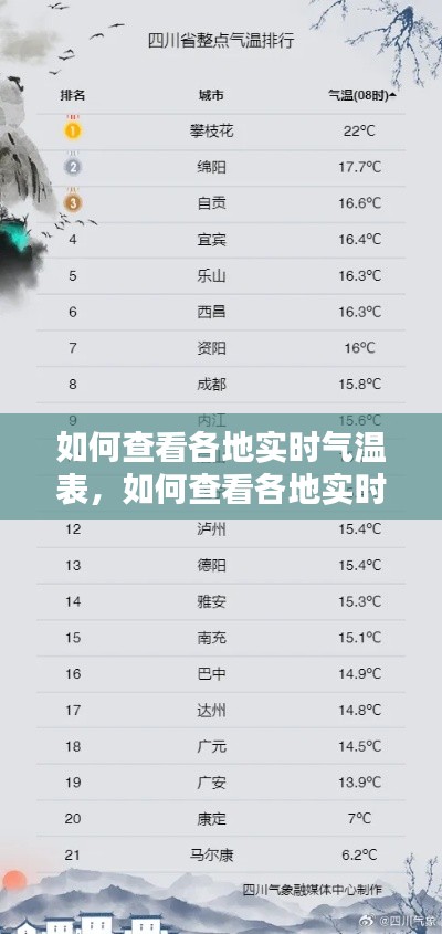 查看各地实时气温表的方法多种多样,您可以根据自己的需求选择合适的方式。无论是通过在线服务、智能手机应用、社交媒体还是电视频道,都能让您轻松获取全球各地的气温信息。在享受便利的同时,也请注意天气变化,做好相应的防护措施。